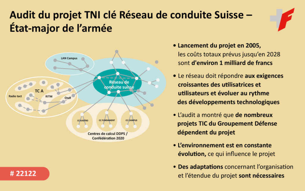 Le Contrôle fédéral des finances (CDF) a audité pour la première fois le projet Réseau de conduite Suisse (rés cond CH) du Département fédéral de la défense, de la protection de la population et des sports (DDPS) en tant que projet à part entière. Son lancement remonte à 2005 et les coûts totaux prévus jusqu’en 2028 avoisinent le milliard de francs. L’essentiel du financement est assuré dans le cadre des messages sur l’armée ou sur l’immobilier militaire. Le projet est réalisé en plusieurs phases, au cours desquelles des demandes de financement sont faites dans le cadre de mandats de projets spécifiques. Le projet est en phase IV au moment de l’audit. Le réseau doit répondre aux exigences croissantes des utilisateurs et évoluer au rythme des développements technologiques. Il est ainsi soumis à un processus permanent d’adaptation et de renouvellement. Autrement dit, d’autres phases de projet sont déjà à prévoir après 2028. Les moyens financiers nécessaires devront être demandés dans le cadre de futurs messages sur l’armée et sur l’immobilier militaire.