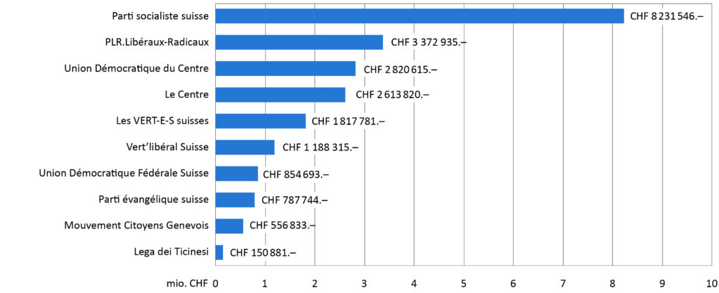 Les recettes totales des partis représentés au Conseil fédéral oscillent entre 2,6 et 8,2 millions